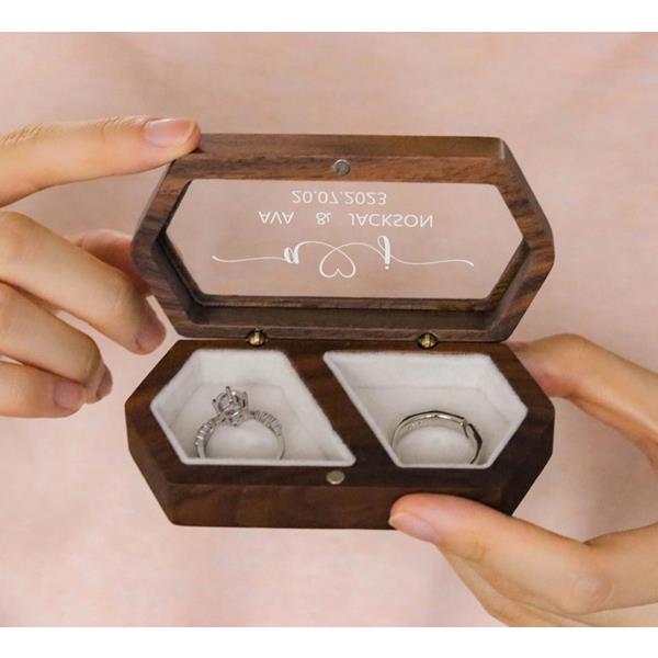 Fabricado con madera de alta calidad, su textura suave y acabados impecables ofrecen una sensación cálida y natural. La tapa transparente permite ver los anillos en su interior, brindando una vista previa del precioso momento en que los novios intercambiarán sus votos. Los dos apartados cuidadosamente diseñados aseguran que cada alianza tenga su propio espacio, destacando su importancia y evitando cualquier roce.