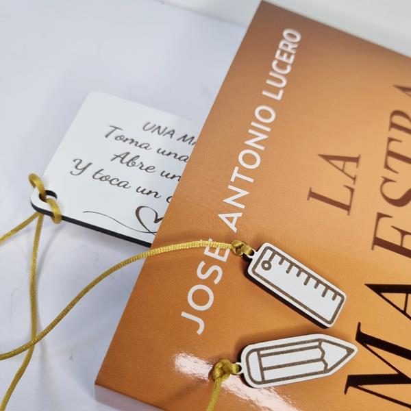 Está fabricado en madera laminada blanca y está diseñado con una frase motivadora que hace referencia a la vocación de enseñar.