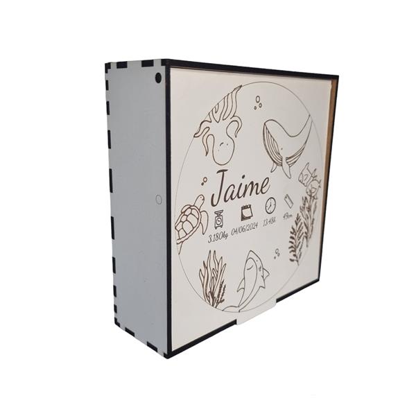 La caja está fabricada en madera laminada blanca y está diseñada para que sirva como decoración en la habitación del bebé, ya que su tapa está decorada y personalizada para tal fín.