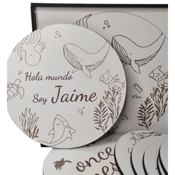 La caja incluye una placa de bienvenida con el nombre del bebé y once placas enumerando los meses desde el primer mes hasta el año. Además de forma opcional, también puedes incluir una placa de la primera semana.
