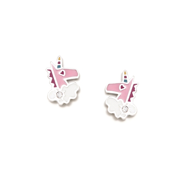 Pendientes de Plata de Ley con la forma de unicornios. Esmaltados en diferentes colores y una pequeña circonita color cristal. Un diseño minimalista y lleno de fantasía.