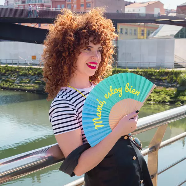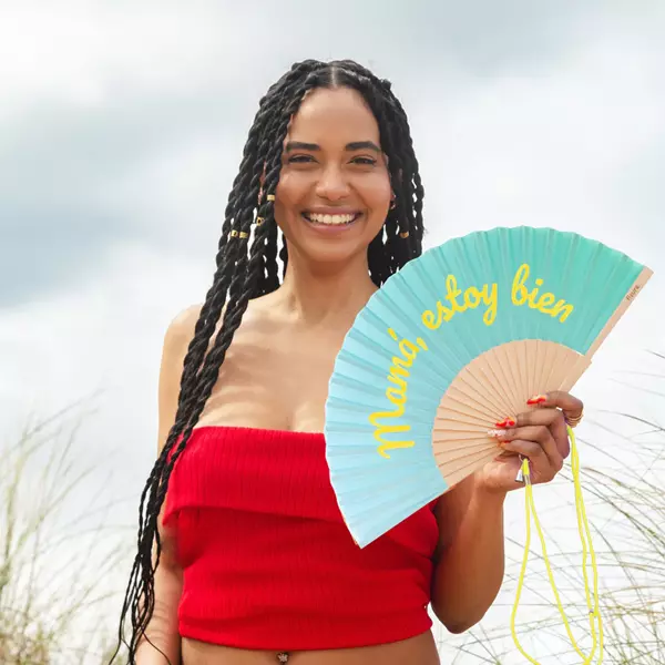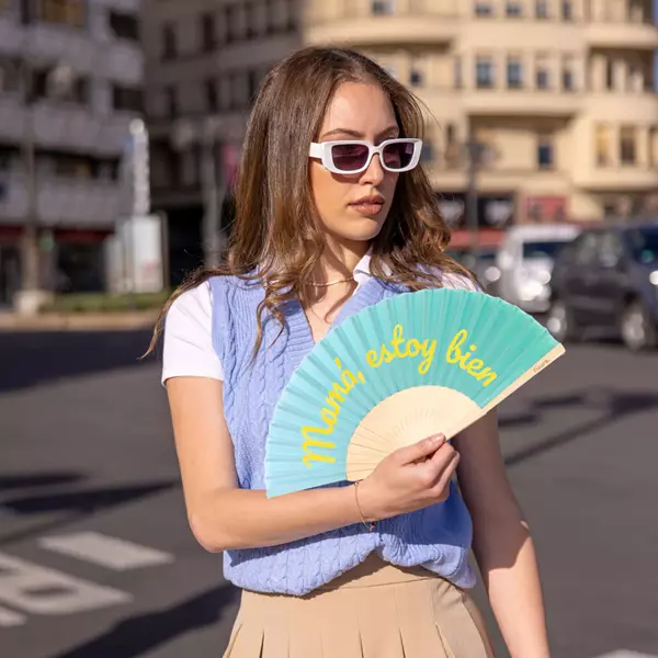 Refréscate y disfruta al máximo con este abanico original en tonos azules y amarillos que le dará a tus “looks” un toque de color. Con su mensaje “mamá estoy bien” es el accesorio de verano perfecto para tus aventuras 🎉. ¡Lleva contigo este abanico con mensaje y hazte una foto con él para que tu madre vea que estás pasándolo en grande!