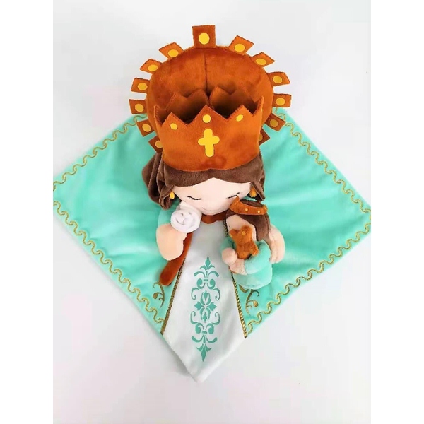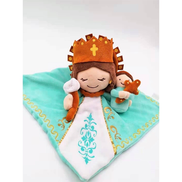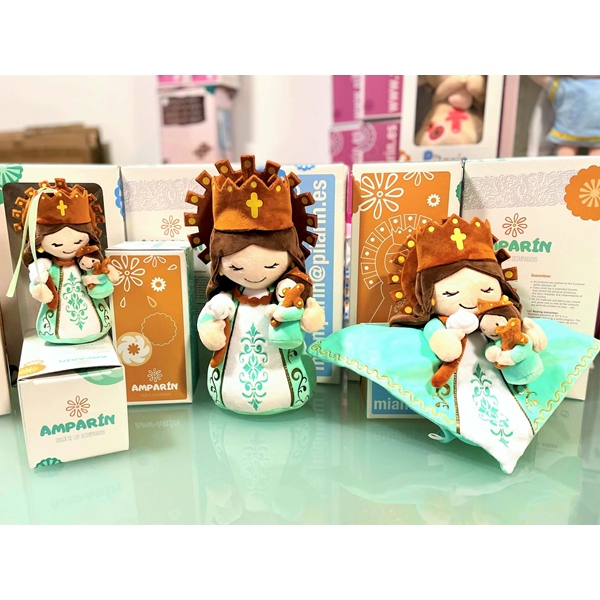 El doudou sonajero Amparín tiene un tacto suave, pensado para los recién nacidos, con el fin de que puedan sentir también la protección de la Virgen de los Desamparados desde sus primeros días.