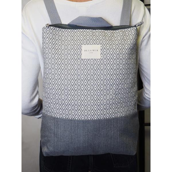 Mochila con asas ajustables y pequeña asa de mano. Combinado con dos tejidos diferentes, un tejido con estampado geométrico blanco y gris en la parte superior, y un tejido liso de coloro gris en la parte inferior. Bolsillo interior con cremallera. Asas de cinta de espiga de algodón de color gris. Para su correcto mantenimiento se aconseja lavarlo en frío y no utilizar secadora.