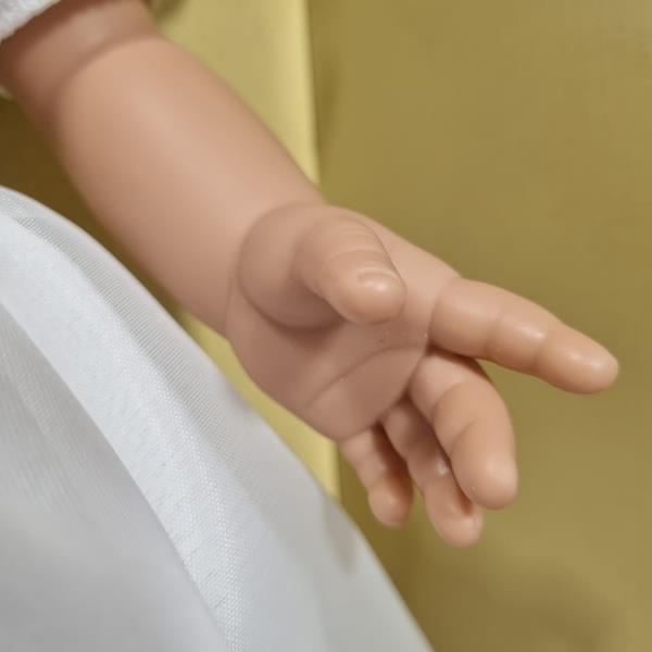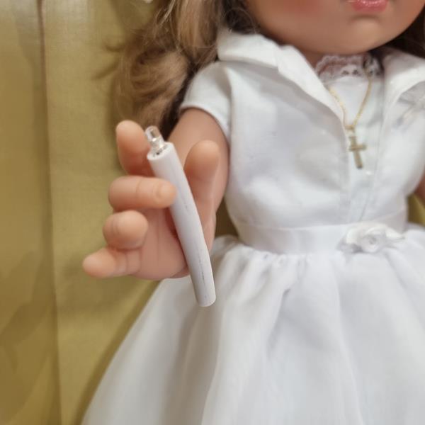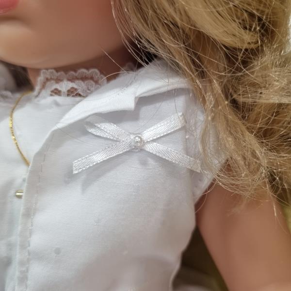 María, la encantadora muñeca de Primera Comunión, es una obra de arte en cada detalle. Con sus 50 cm de altura, destaca con su hermoso vestido blanco adornado con encaje delicado y una medallita dorada que brilla con elegancia. Su cabello rubio, peinado con cuidado, le confiere un aire angelical. Un lazo de organza blanco completa su bonito vestido.