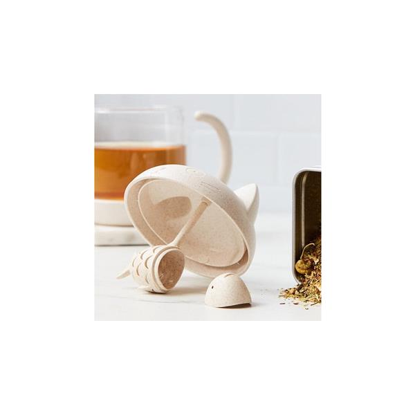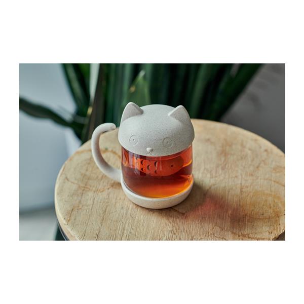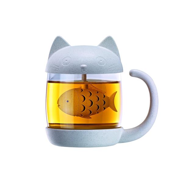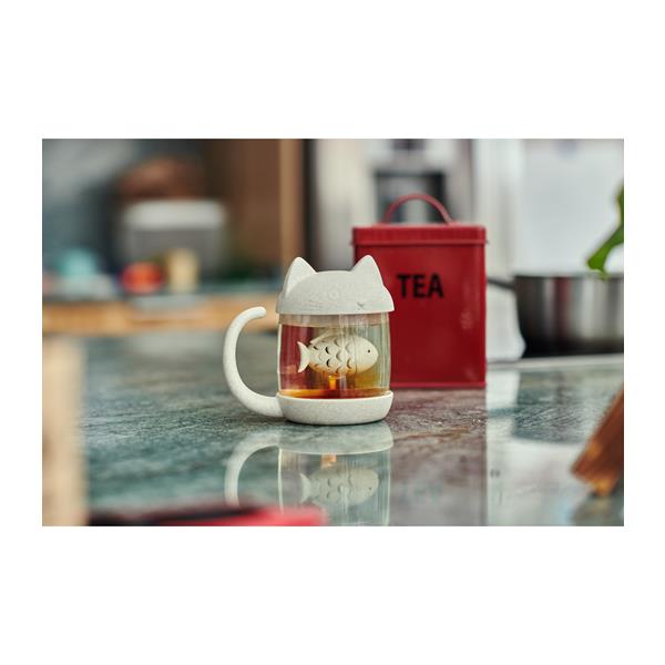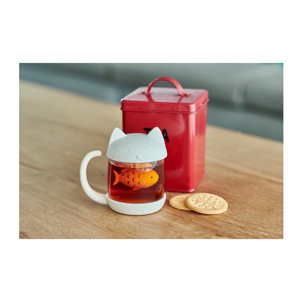 Además, una vez quites la tapa, las gotas de té del infusor caerán sobre ella evitando que ensucien la mesa. La taza está fabricada con vidrio y fibras vegetales, unos materiales muy resistentes. Para mantenerla como el primer día deberás lavarla a mano. Taza de té con forma de gatito y pez infusor.