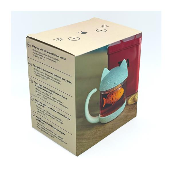 La taza de té gatito va embalada en una caja de cartón ilustrada.